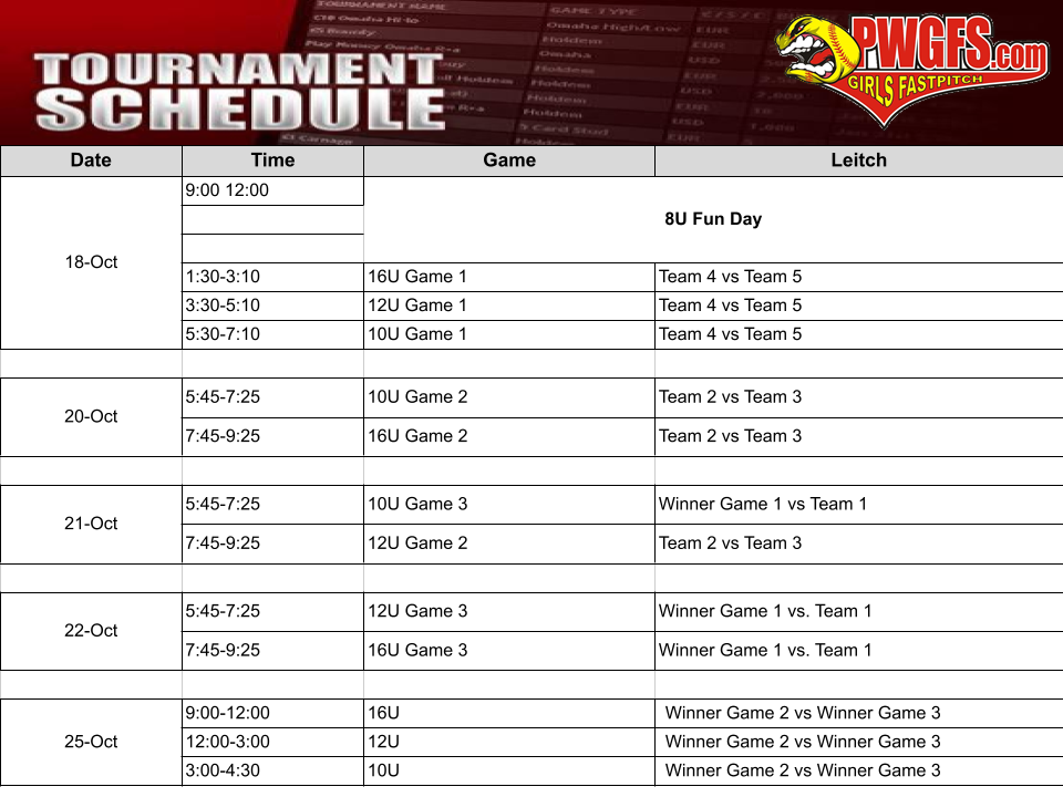 Fall 2025 Tournament starts Saturday, October 18.  The Championship games for 10U, 12U, and 16U will be on Saturday, October 25.  8U will not be participating in the Tournament as they will have a FunDay instead, which is on Saturday, October 18.